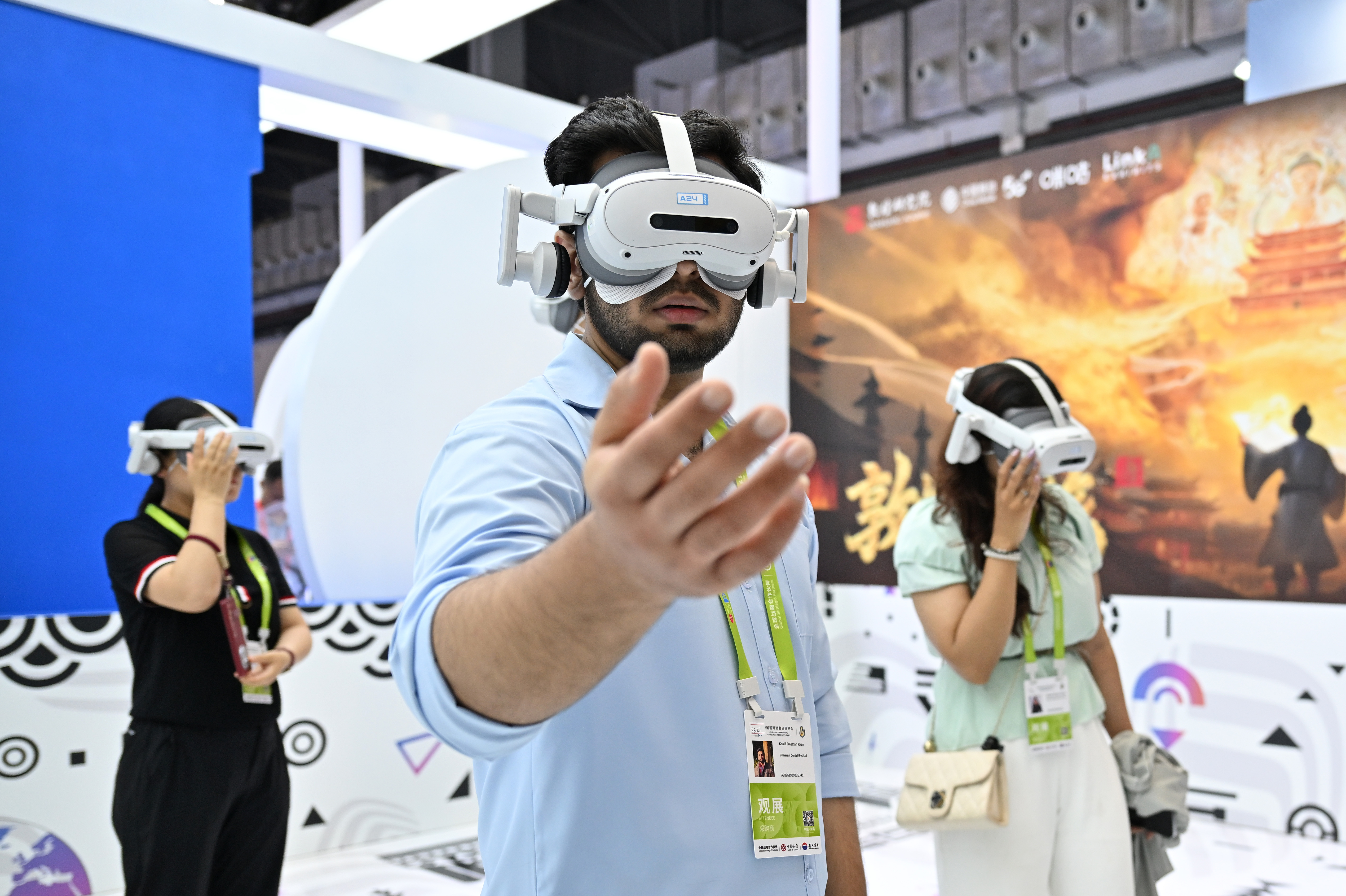 4月13日,参观者在海南举办的第六届消博会现场体验一款VR设备。 新华社图