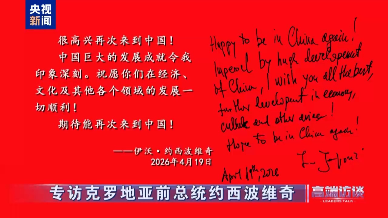 △克罗地亚前总统约西波维奇在接受总台专访后题词