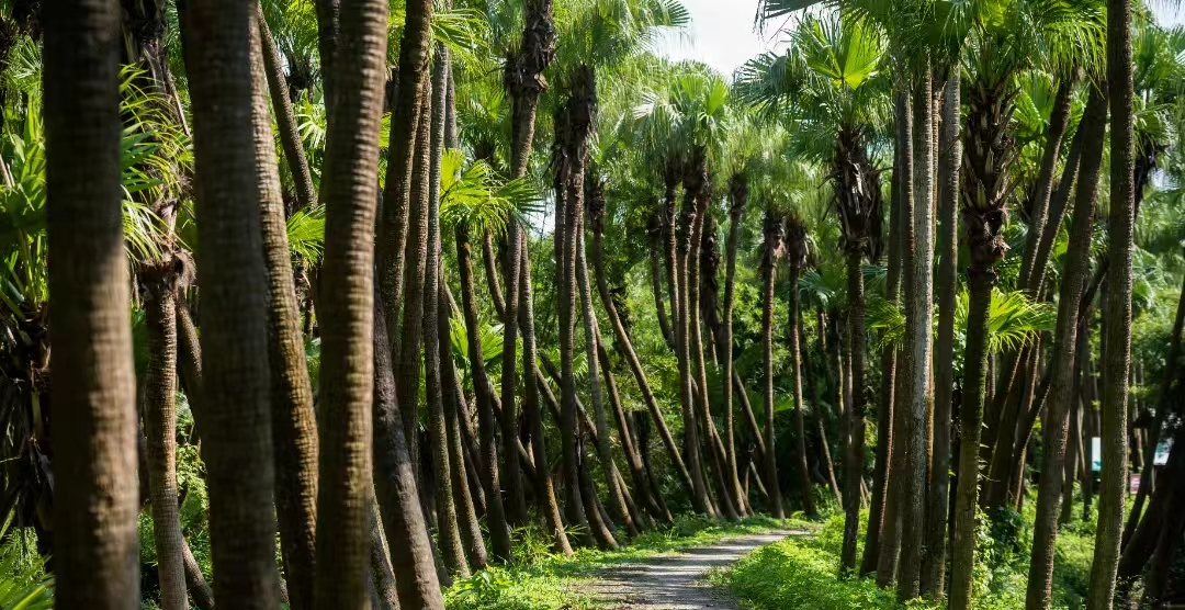 放眼望去,成片的蒲葵树高大挺拔,葵叶宽阔舒展。微风吹过,无数葵叶沙沙作响,波光与树影交织出一幅独具岭南气韵的交响画卷。
