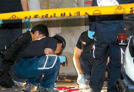 警员庄志强在停车场开枪误伤派出所长后自杀,留下大片血迹,鉴识人员到场采证。来源:台湾《苹果日报》