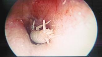 据报道,这名50岁男子到台北马偕医院就诊时,只觉得耳朵里怪怪的,偶尔会听到耳鸣声,但不觉疼痛。马偕医院耳鼻喉科医师周家仪透过内视镜,在距离男子外耳道约1.5厘米处,发现一只黄白色、带有触须的小虫,不时蠕动身体,想往耳朵更深处钻,周家仪以耳抽吸管活逮这只小虫。