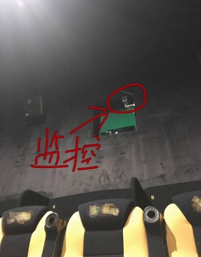我站在前排,远远看到影厅最后排上方放映机的位置,有一只白色的长筒监控,还是很显眼的。此外周围再未见到别的监控。