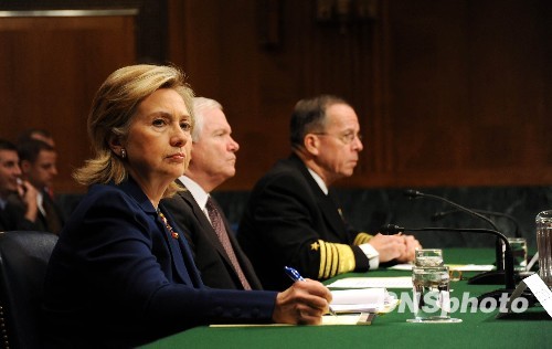 美国国务卿希拉里、国防部长盖茨(中)、美国参谋长联席会议主席马伦2日上午共同出席参议院有关新阿富汗战略的听证会。希拉里表示,美国并未锁定撤出阿富汗,提出撤军时间表是为了表明美国无意占领阿富汗。 中新社发 李静 摄