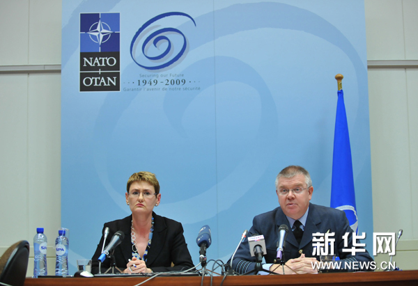 资料图片:3月25日,在比利时首都布鲁塞尔的北约总部,北约发言人瓦娜·伦杰斯库(左)与北约国际军事参谋部军事行动部门的军官布斯介绍对利比亚军事行动的情况。北约秘书长拉斯穆森24日宣布,北约决定在利比亚设立禁飞区,并将在数天内从美国手中接管禁飞区指挥权。新华社记者武巍摄
