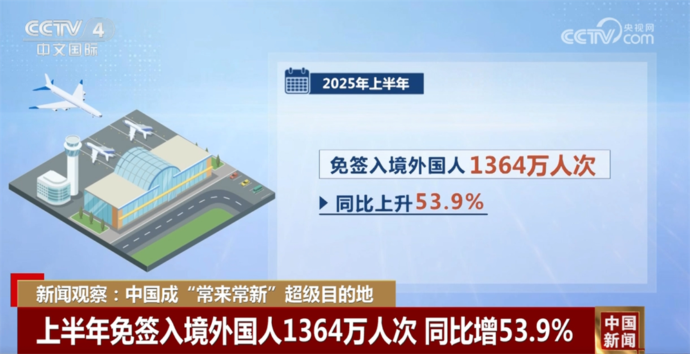 央视网消息:国家移民管理局7月16日发布的上半年移民管理数据显示:今年上半年,3.33亿人次出入境,免签入境外国人1364万人次,同比上升53.9%。在免签“朋友圈”扩容、“即买即退”离境退税政策的推动下,“China Travel”持续升温。外国人的中国之旅正在转向文化、生态、科技等多元融合的深度体验,中国正成为外国人青睐的“常来常新”的超级目的地。