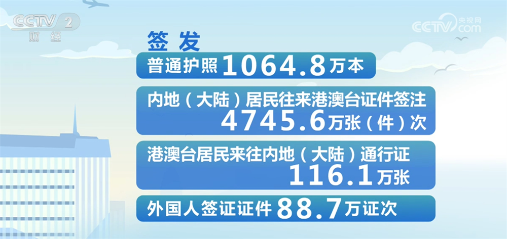 共签发普通护照1064.8万本、内地(大陆)居民往来港澳台证件签注4745.6万张(件)次,签发港澳台居民来往内地(大陆)通行证116.1万张;签发外国人签证证件88.7万证次。