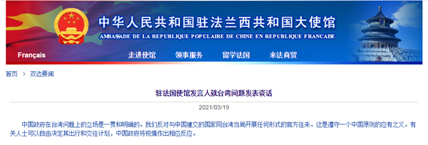 中国台湾网3月22日讯 日前,中国驻法国使馆发言人就台湾问题发表谈话。发言人表示,中国政府在台湾问题上的立场是一贯和明确的。我们反对与中国建交的国家同台湾当局开展任何形式的官方往来。这是遵守一个中国原则的应有之义。有关人士可以自由决定其出行和交往计划,中国政府将视情作出相应反应。