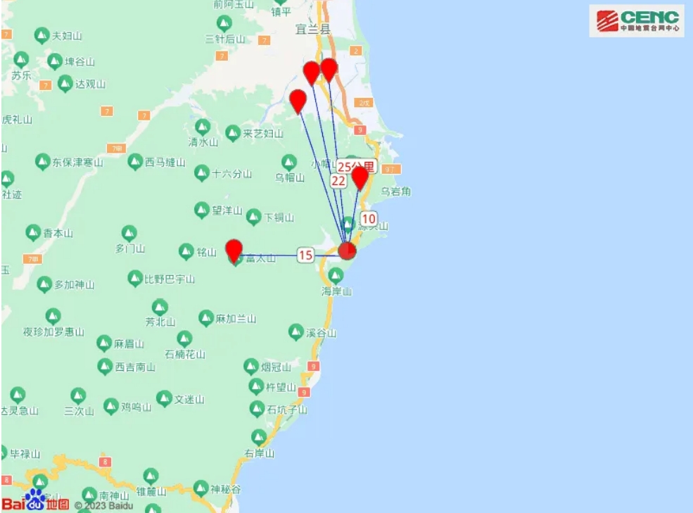 周边县城:震中距苏澳镇10公里、距南澳乡15公里、距冬山乡22公里、距五结乡25公里、距罗东镇25公里,距宜兰县31公里,距台北市69公里。