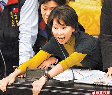 民进党“立委”陈亭妃一妇当关,万夫莫敌,趴在主席台上,不让主席上台开会。 来源:台湾《苹果日报》