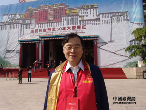 4月25日下午,中国和平统一促进会第八届海外统促会会长会的与会代表,参观西藏民主改革50年大型展览。图为王津平在展厅外。(中国台湾网 杨丽 摄)