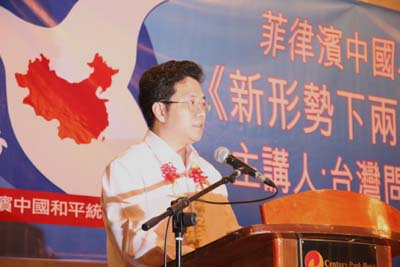 邓代办首先感谢菲律宾和统会组织此次讲座,并表示,台湾问题关系到中国统一大业,关系到中国人民的核心利益和海外炎黄子孙的民族感情。从1979年全国人大叶剑英委员长的告台湾同胞书,到今年元旦胡锦涛主席的最新讲话,都体现了中国政府以最大诚意、尽最大努力解决台湾问题的决心。邓表示,2008年以来,台海地区形势发生了有利于两岸关系缓和的积极变化。新形势下两岸关系如何发展,新形势下广大海外华人华侨的反“独”促统工作如何推进,这是包括菲律宾在内的全世界华夏儿女共同关心的大事。相信专家的讲座对于廓清2008年台湾地方政府更迭后的两岸关系,厘清对新形势下两岸关系的认识,推进菲律宾地区反“独”促统工作都会是非常有益的。