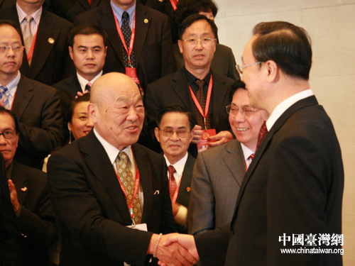 全国政协副主席、中共中央统战部部长杜青林与参加中国和平统一促进会第七届海外统促会会长会的海外统促会会长亲切握手。