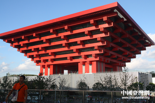 同学们一个接一个地在雄伟的中国馆前拍照留念。(中国台湾网 肖燕 摄)