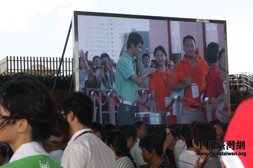 排队等候进馆期间,一位同学接受中国馆表演区主持人的现场采访。(中国台湾网 肖燕 摄)