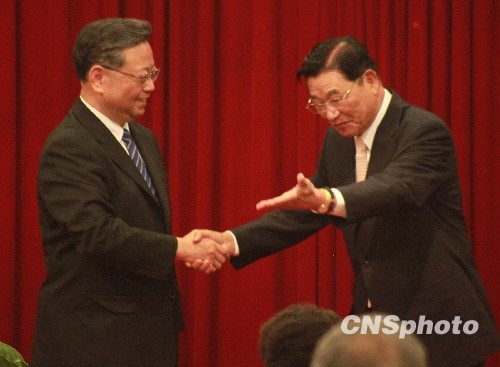 5月5日,台湾海基会董事长江丙坤在台北圆山大饭店举行午宴,欢迎福建省长黄小晶率福建省经贸文化交流团来台访问。两位老朋友相见甚欢,期待透过此次访问进一步推动两地全方位交流合作。 中新社发 罗钦文 摄
