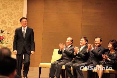 4月6日下午,中国国民党荣誉主席连战(右二)以茶叙的方式,在其赴美领取一个奖项前招待“老朋友”上海市长韩正。图为韩正简短致辞推介世博会,连战夫妇、王金平(右四)、郝龙斌热烈鼓掌。 中新社发 董会峰 摄