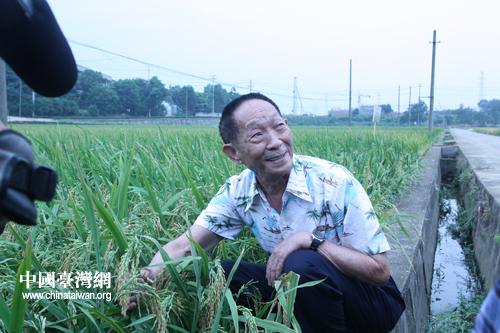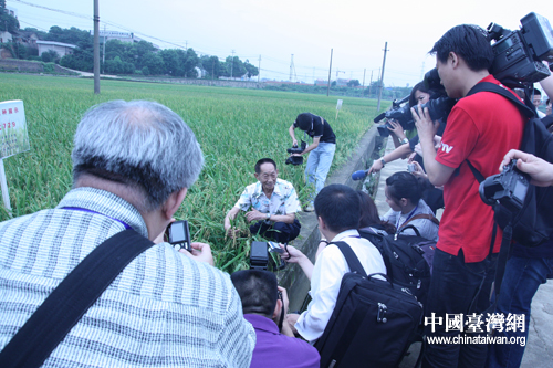 7月16日,两岸记者联合采访袁隆平院士。图为袁隆平在实验田边被两岸记者热情围拍。(中国台湾网 杨丽 摄)