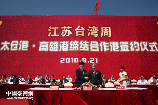 中国台湾网9月21日太仓消息 9月21日,江苏太仓港与高雄港缔结合作港签约仪式在太仓港集装箱码头举行。标志着太仓港与台湾经济领域的合作进一步加强。(记者 钟宝华)