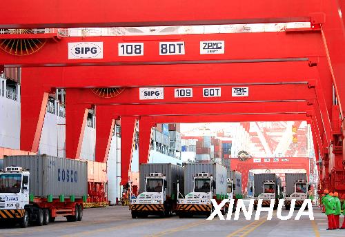 进行集装箱装卸作业的上海洋山深水港区一景(2008年12月6日摄)。新华社记者陈飞摄