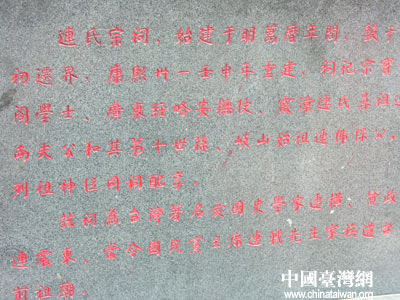 中国台湾网4月19日漳州消息 去年,连战到访大陆时,西安小朋友深情厚意的一句“连爷爷,您回来了”,成为两岸人民耳熟能详的一句佳话,昨天,“连爷爷”前往自己的祖籍地漳州马崎祭祖,一偿其祖父,也是我国著名爱国学者连横的夙愿。连战在宗祠进行完祭祖仪式后,公开发表讲话,他兴致所致、情感所动,也激动地喊出:爷爷,我回来了!我终于回来了!