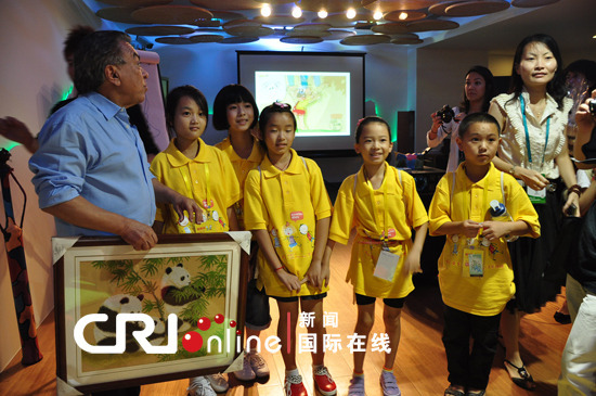 活动现场,巴西漫画大师毛利西奥教小朋友们如何创作漫画,一起和小朋友们观看以他设计的“莫妮卡”为形象的动画片,并向孩子们赠送了漫画书和小玩具,而孩子们也为漫画家送上了他们特意准备的礼物——来自四川的熊猫十字绣。活动现场到处洋溢着欢乐的气氛。