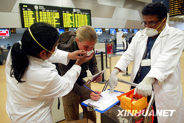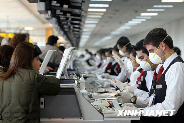 5月21日,秘鲁首都利马国际机场的工作人员全部戴口罩工作,以防感染甲型H1N1流感病毒。自4月23日起,利马国际机场实行24小时流行病监测。到目前为止,已有10多万名来自墨西哥和美国等疫情国家的人员接受了卫生检疫,有16人被确诊患有甲型H1N1流感。新华社发