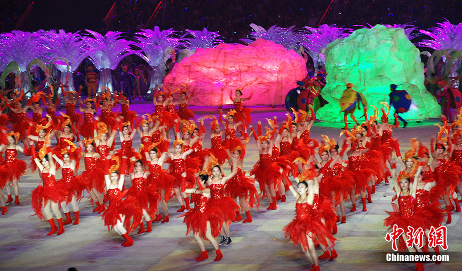 广州2010年亚残运会12月12日晚,在广州盛大开幕,开幕式晚会以“大爱、动人、自强不息”为主题,由倒计时与入场仪式、文艺表演的《心声》、《追梦》、《飞翔》三个篇章及点燃圣火等几个部分组成。图为开幕式文艺表演。 中新社记者 程景伟 摄