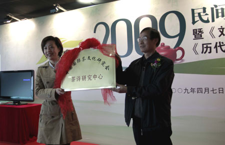 中国国际茶文化研究会副会长沈才土与四季青办事处主任张玮参加了中国国际茶文化研究会茶诗研究中心交接牌仪式。