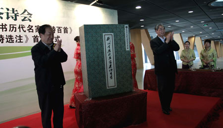 2009民间茶诗会可以说是一道茶诗盛宴,《刘枫书历代名家茶诗百首》、《历代茶诗选注》首发仪式也在活动中举行。徐永清上将、刘枫会长为《刘枫书历代名家茶诗百首》、《历代茶诗选注》两书首发揭幕;随后还向浙江省图书馆、浙江省档案馆、杭州市图书馆和杭州市档案馆进行赠书仪式,四家单位将永久性收藏这一珍贵的书籍。