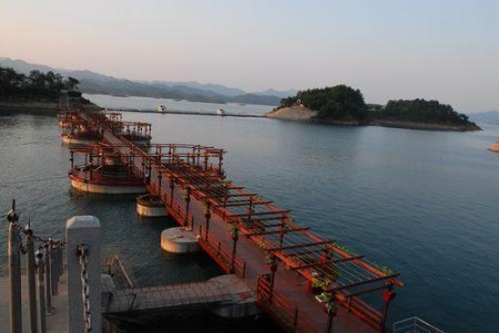 湖上的幸运桥目前是国内跨度最大的水上浮桥,总长230米。桥上采用无土栽培技术,偏植瓜果花草和水生植物,桥身两侧喷泉抽取千岛湖深层恒温湖水,在桥身上空交错排列形成“秀水走廊”,也是桥上的天然空调。