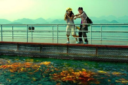 吉祥鱼在鱼乐桥上。鱼乐桥也是一座水上浮桥,浮桥中间水池内放养着78种千岛湖淡水鱼,其中鲤鱼争食是这里的一大奇观。千岛湖中体型最大、分量最重的螺蛳青就放养于此,陪伴它的,还有号称“白娘子”的大白鳙鱼。